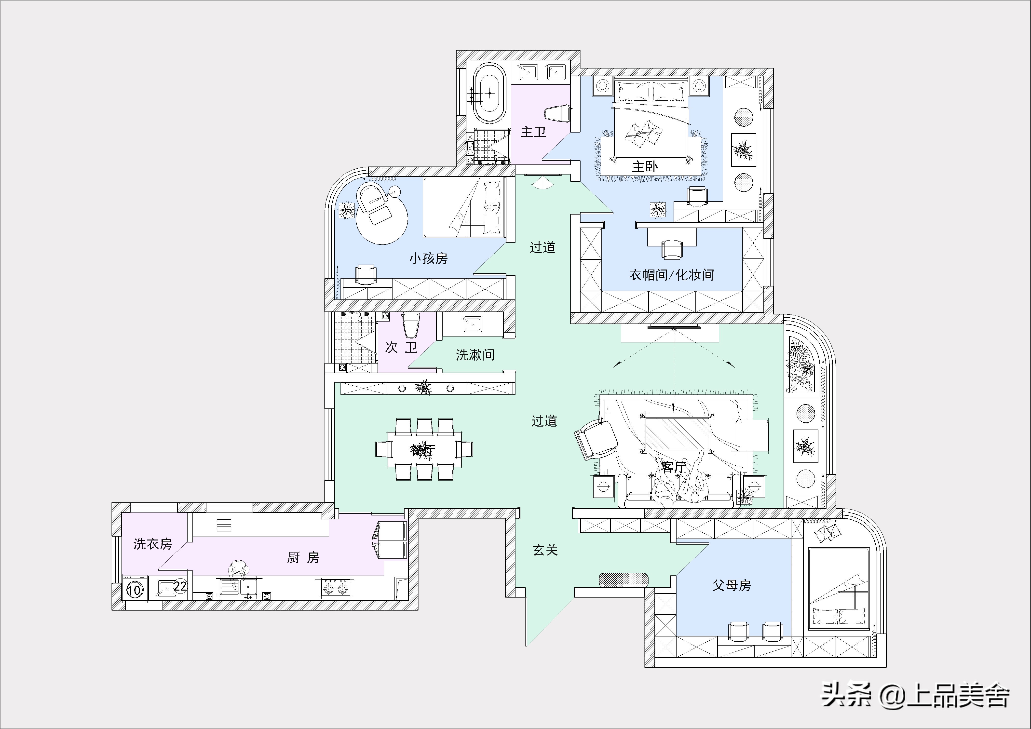 原始结构较为大气,南北通透,主要是解决主卧的功能协调以及主卫的使用问题。