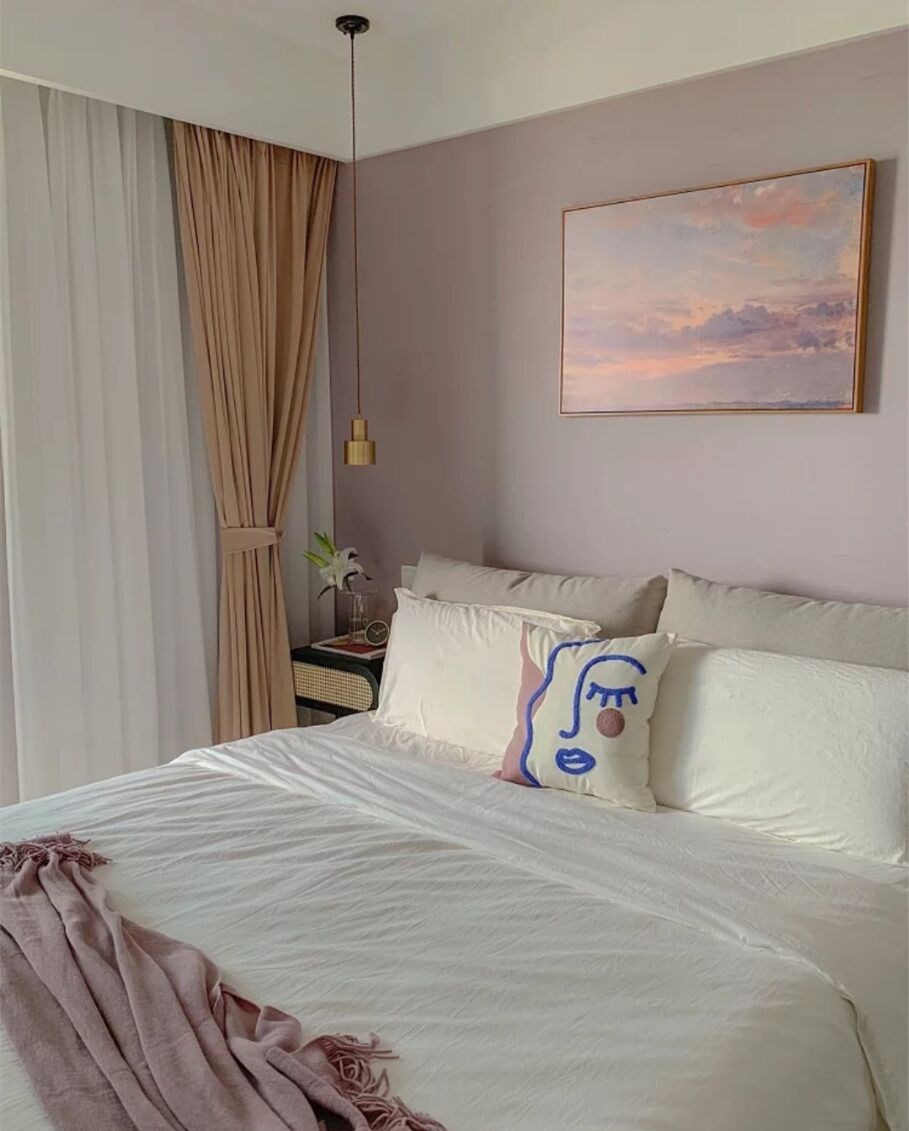 主卧设计简单,全屋都是奶萌奶萌的颜色,既不会白的亮眼,也不会白的单调。清澈中透着柔和于舒适!