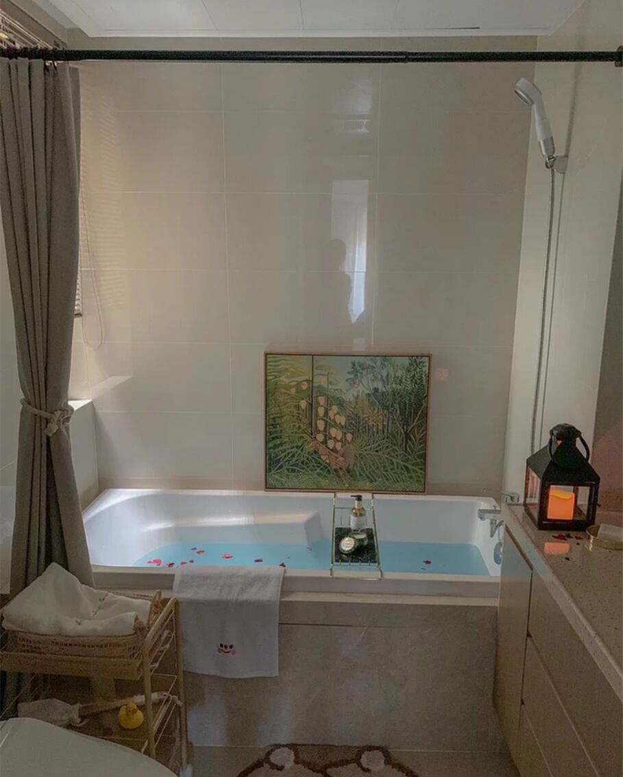 主卫的卫生间带个大浴缸。女主人喜欢有情调的设计,浴缸上面还放了一个置物架。躺在浴缸里可以边铺泡澡边喝点红酒。手机、甜点之类的也能放在这上面!生活简直太美好了!