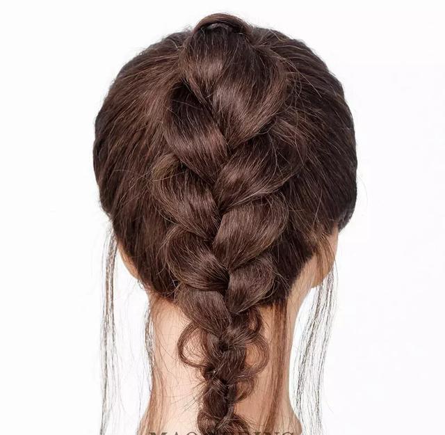 第八步:把中间剩下的头发编成麻花辫,编到发梢,用橡皮筋扎好。